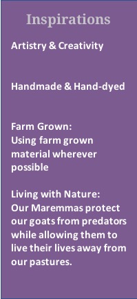 Meet Melanie: I love working with mohair, hand-dyeing, and hand-spinning. My favorite is lock and tail spinning mohair yarn.My hand-dyeing is inspired by my goats, Michigan, Scotland and the wonders of nature. I enjoy exploring new processes and color combinations. Taking care of the goats is truly my calling. My beautiful fleeces reflect half a year's work of tending and caring for my goats as they grow their mohair.